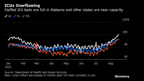 根据美国卫生和公共服务部(HHS)的数据,在阿拉巴马州,全州重症监护病房(ICU)的患者人数已经超过可用床位。佛罗里达州、密西西比州、佐治亚州和德克萨斯州ICU的使用率都超过了90%。