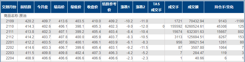 上海原油价格下跌,收于三个月低位,主力合约2110终盘收于405.3元/桶,跌9元/桶,跌幅2.17%。
