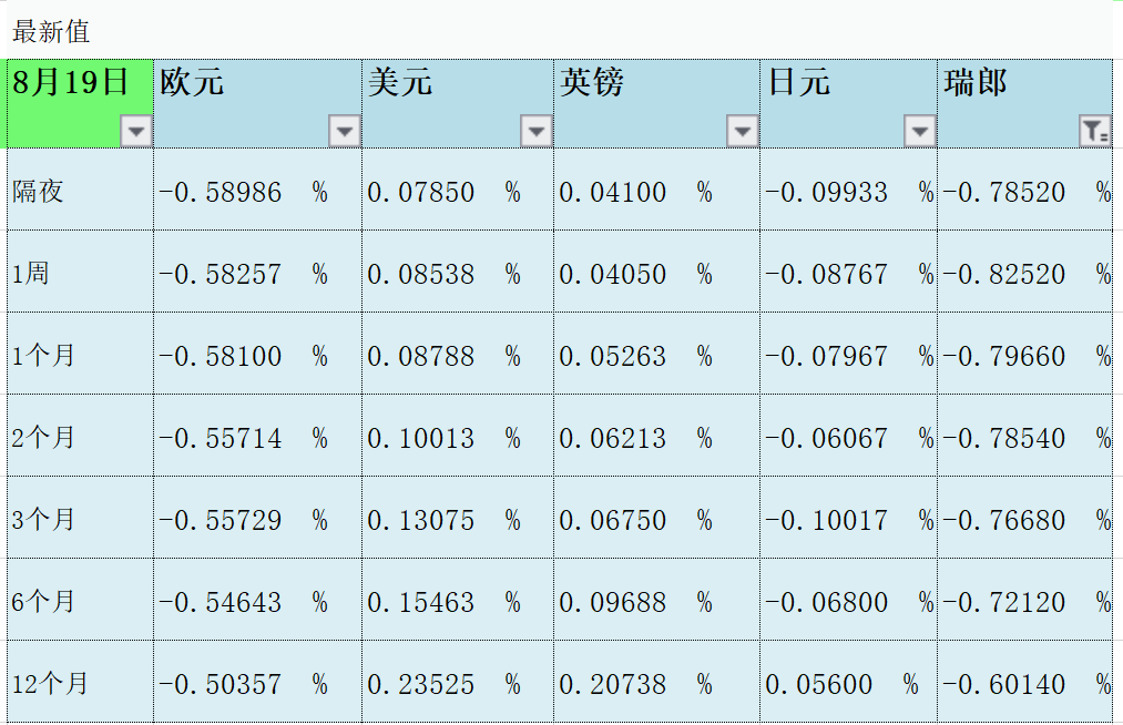 1个月LIBOR:欧元报-0.58100%,美元报0.08788%,英镑报0.05263%,日元报-0.07967%,瑞郎报-0.79660%。