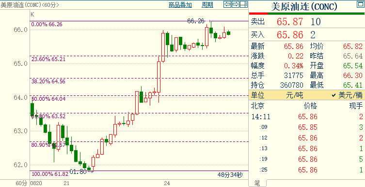 北京时间14:12,NYMEX原油期货上涨0.32%至65.85美元/桶;ICE布伦特原油期货上涨0.41%至69.03美元/桶。两市隔夜分别暴涨5.47%和5.82%。