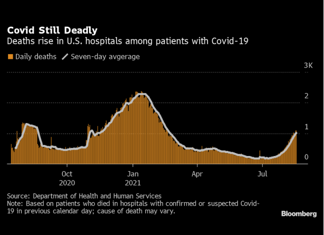 美国医院的新冠患者死亡人数又回升到2月份以来的最高水平,根据HHS数据,截至周三,在美国医院中确诊或疑似新冠病例死亡人数的7天均值升至1016人,为2月22日以来最高。