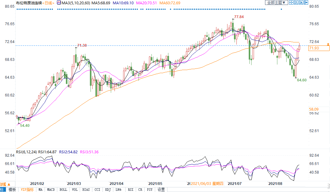 周三(8月25日)美油期货上涨0.82美元,涨幅为1.2%,结算价报68.36美元/桶;布油上涨1.2美元,涨幅为1.7%,报收72.25美元/桶。过去三个交易日,布伦特原油和美国原油均上涨了约10%。这波反弹基本上抹去了上周因新冠病例反弹而引发的暴跌。此前EIA报告显示,截至8月20日当周,原油库存下降298万桶,汽油库存下降224.1万桶,同时美国成品油需求达到2020年3月以来的最高水平,为油价持续上行提供动力。