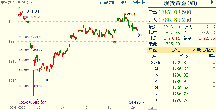 小时图上看,金价自1810美元开启回调(ii)浪走势,下方支撑看到1779美元和1760美元,它们分别是自1680美元开启的上行(i)浪的23.6%和38.2%斐波那契回档位。(i)浪是同样自1680美元开启的上行((i))浪的子浪。