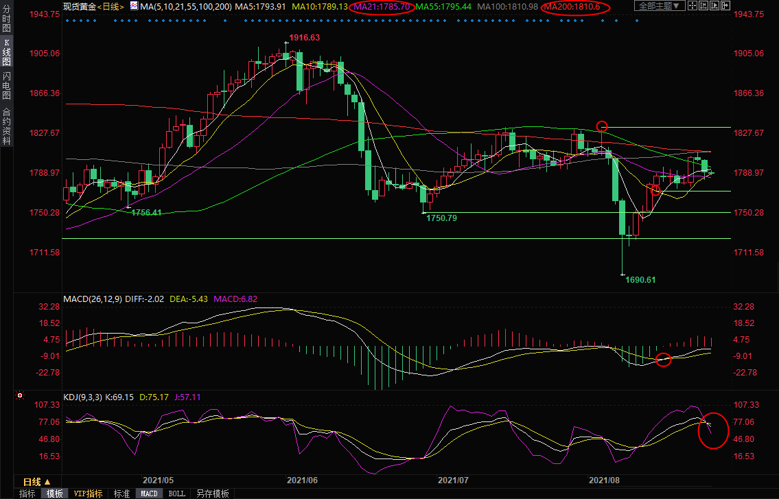 日线级别:震荡;均线交织,MACD金叉,KDJ死叉,短线走势变数较大,鉴于之前金价的反弹受到100日均线和200日均线双重阻力压制,目前该阻力在1810.6附近,在顶破该位置前,金价后市略微偏向震荡下行。初步支撑在21日均线1785.73附近,1780关口也可以予以留意;然后8月16日低点支撑在1770.93附近,如果失守该支撑,则增加短线看空信号。