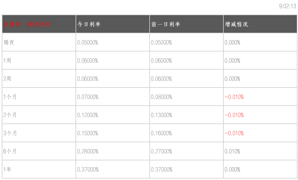 08月26日香港银行间同业拆借利率港币:隔夜报0.05% 1周期报0.06% 1月期报0.07% 3月期报0.15% 6月期报0.28%