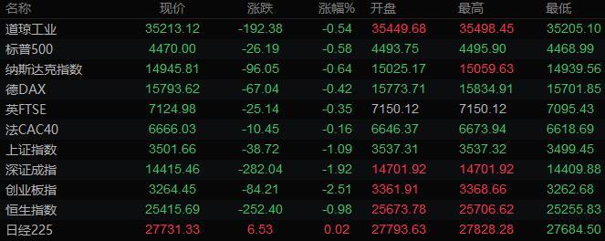 美股收盘情况:道琼斯指数收盘下跌192.38点,跌幅0.54%,报35213.12点;标普500指数收盘下跌26.38点,跌幅0.59%,报4469.81点;纳斯达克综合指数收跌96.1点,跌幅0.64%,报14945.8点。