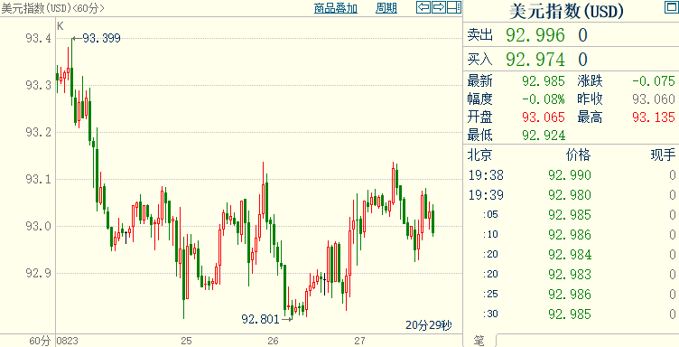 北京时间19:38,现货黄金上浮0.18%至1795.72美元/盎司;COMEX期金主力合约上浮0.13%至1797.6美元/盎司;美元指数下跌0.08%至92.984。