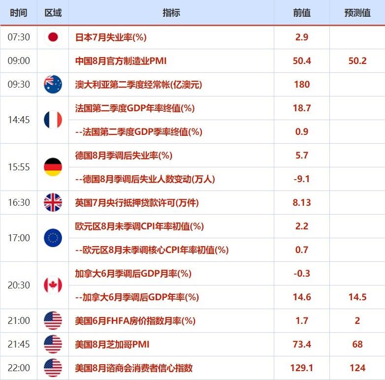 周二(8月31日)关键词:中国8月官方制造业PMI,欧元区CPI数据