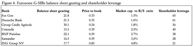 如图4中欧元区全球系统重要性银行(G-SIBs)的表所示,法国农业信贷银行(Credit Agricole)的资产负债比率(即资产负债表资产与资产负债表股本的比率)都异常之高,高达30多倍。法国兴业银行和德意志银行等银行对股东的隐含杠杆率超过60倍,相比之下,美国G-SIBs的平均负债率约为11倍。尽管美国G-SIBs的市净率平均约为1.3倍,但欧元区G-SIBs的市净率均未超过1倍。