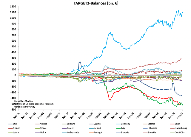 由欧洲央行通过Target2向欧元体系提供的债务抵消。但根据规定,如果TARGET2体系出了问题,成本将由欧洲央行按照预先设定的资本关键公式分摊。以德国为例,它占欧元区各国央行资本键的26.38%。如果TARGET2崩溃,德国央行将损失其他国家央行欠它的逾万亿欧元,而必须支付高达4000亿欧元的净损失。
