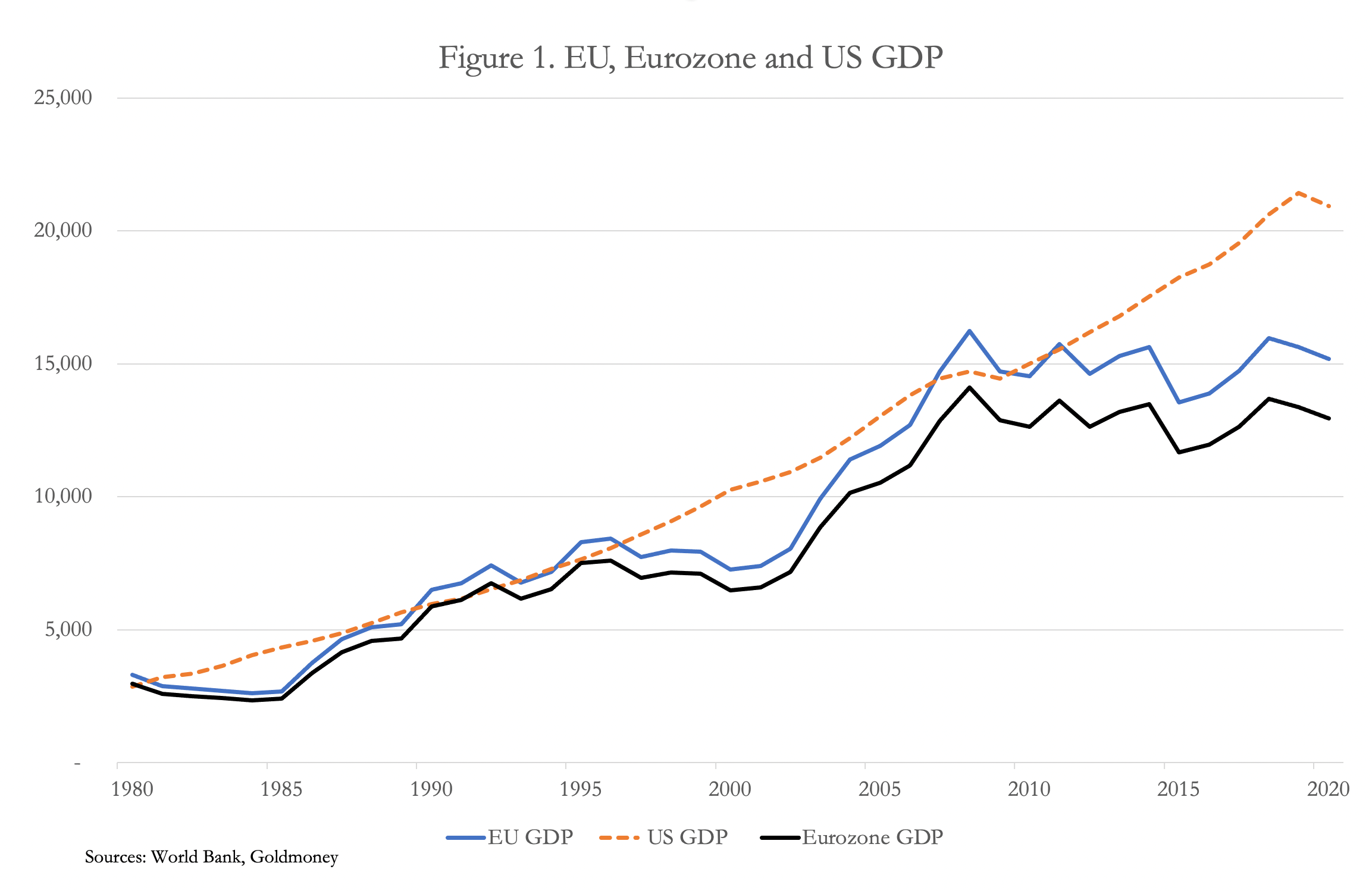 自雷曼危机以来,欧盟相对于美国一直停滞不前,如图1中的年度GDP图表所示。自1994年以来,欧元区和非欧元区成员国之间的GDP增长差距从总GDP的9%增加到15%,甚至对新成员国进行了调整。尽管欧洲央行在大量印钞,但使用本国货币面临同样监管和交易限制的非欧元区成员国的表现明显优于欧元区。