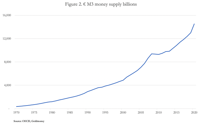 新冠疫情的后果似乎尚未在官方GDP数据中得到充分反映,欧元货币供应的加速增长将推高官方GDP数据。如下图2所示,2020年广义货币大幅增长,主要是由于欧元区央行余额的扩大。