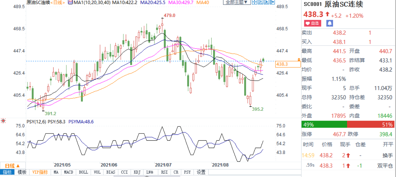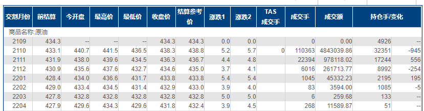 上海原油价格上涨,主力合约2110终盘收于438.3元/桶,涨5.2元/桶,涨幅1.20%。