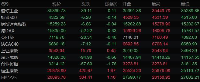 美股收盘情况:道琼斯指数收盘下跌40.89点,跌幅0.12%,报35358.95点;标普500指收盘下跌5.19点,跌幅0.11%,报4523.60点;纳斯达克综合指数收跌6.7点,跌幅0.04%,报15259.2点。