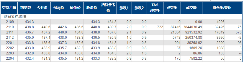 上海原油价格上涨,主力合约2110终盘收于440.8元/桶,涨2.0元/桶,涨幅0.46%。
