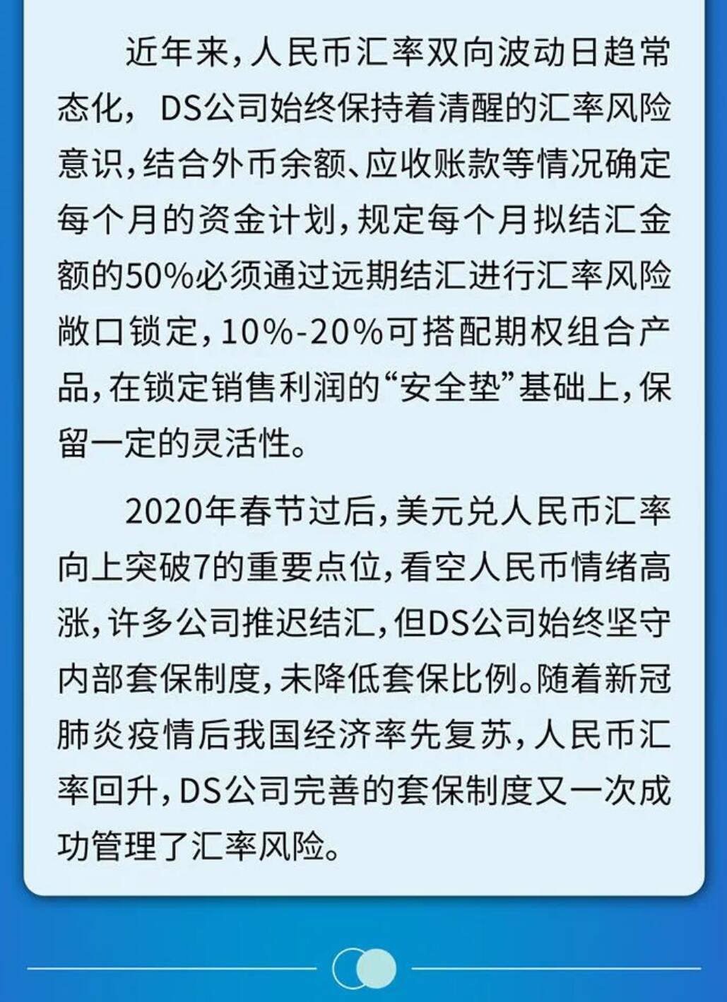 一张图:汇率避险经验之上市公司篇 2021-09-01 21:01 DS公司执行套期保值制度防范汇率风险已经10余年了。十多年前,DS公司大量的外汇收支常常暴露在汇率风险中,曾让其资金总监韦总感到担忧……制作:国家外汇管理局江苏省分局