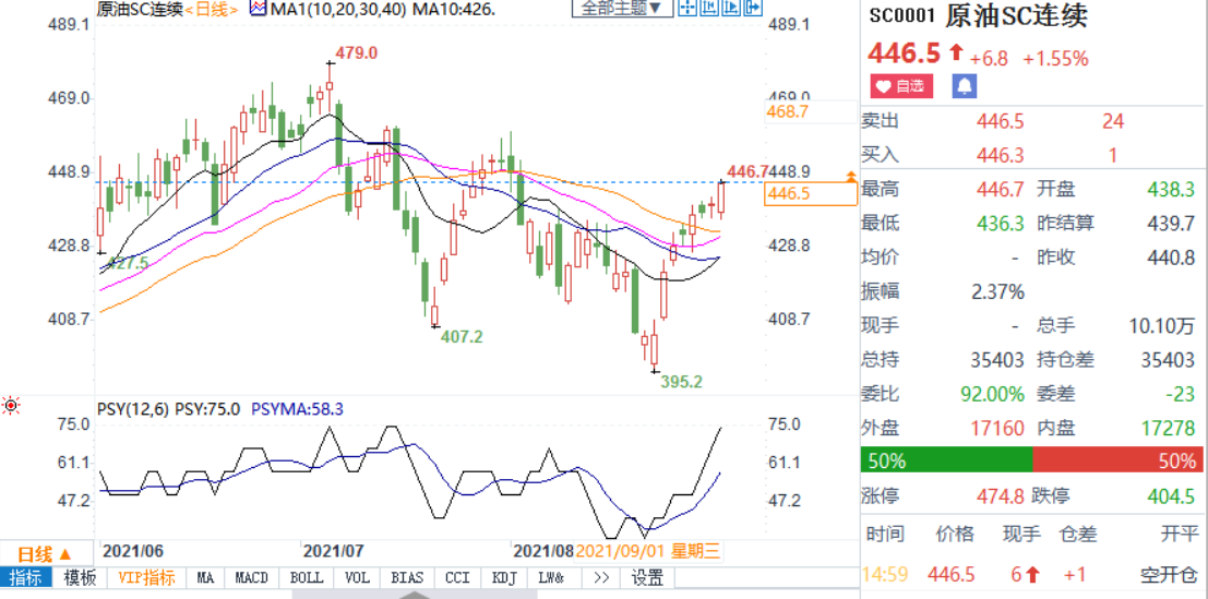 周三(9月1日)上海原油价格上涨,上海原油价格上涨,主力合约2110终盘收于446.5元/桶,涨6.8元/桶,涨幅1.55%,盘中刷新四周新高446.7元/桶。美国原油期货价格在石油输出国组织及其盟友(OPEC+)会议前持稳于69美元上方,主要产油国将在会议上决定继续执行现行的供应增加计划。与此同时,亚洲的新冠病例飙升,美国炼油厂评估飓风“艾达”(Ida)来袭后的水灾损失。