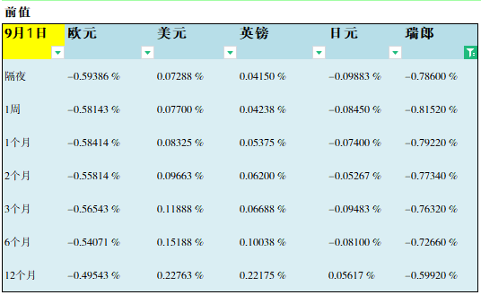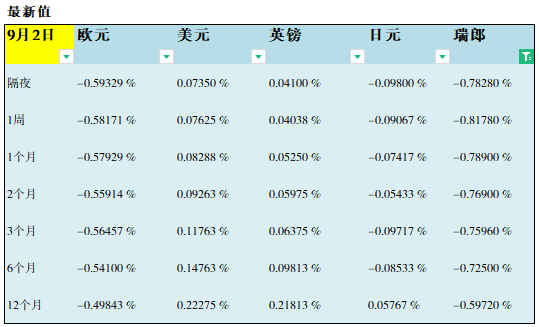 1个月LIBOR:欧元报-0.57929%,美元报0.08288%,英镑报0.05250%,日元报-0.07417%,瑞郎报-0.78900%。
