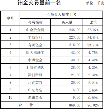 铂金交易方面,山金贵金属占据榜首位置,买入量达245千克,占比27.02%,工商银行第二,有研亿金第三。