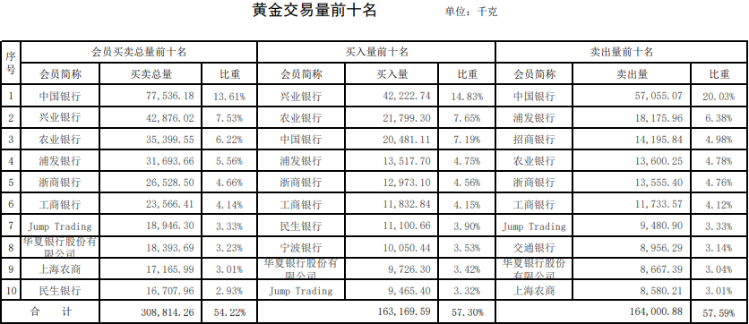黄金交易方面,中国银行占据榜首,占比从11.98%涨至13.61%。