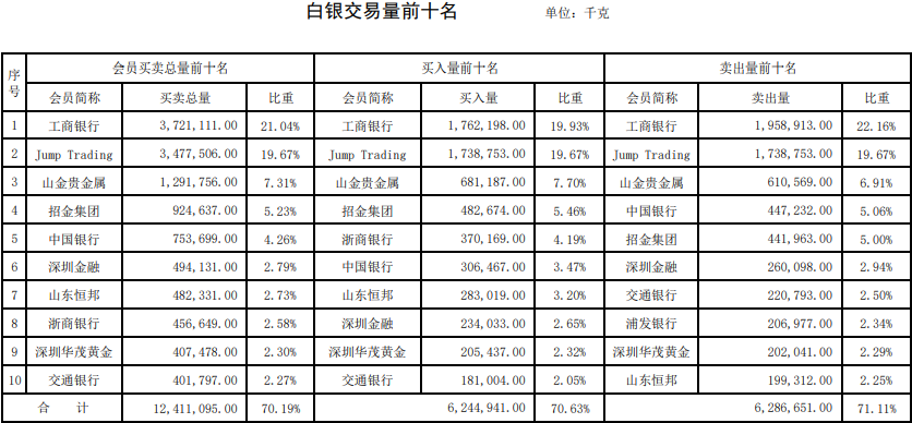 白银交易方面,工商银行位居榜首,成交比重22.30%跌至21.04%,量化交易机构Jump Trading排名第二,成交占比从20.92%跌至19.67%。