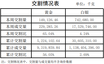黄金交割比由65.14%跌至65.04%,白银交割比从3.96%升至4.24%。