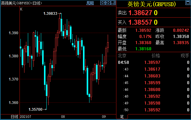 英镑兑美元也二连阳,收升0.74%至1.3857,并创8月9日以来新高1.3891。尽管如此,英镑面临的不利因素在累积。供应链问题和工人短缺打压制造业者的疫后复苏进展。8月最后一周,英国新增新冠病例数创一个多月以来最高。
