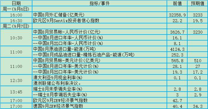 周一(9月6日)、周二(9月7日)关键词:中国贸易帐、中国外储、澳洲联储决议