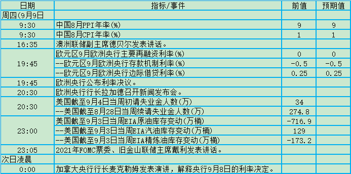 周四(9月9日)关键词:中国通胀、德贝尔、欧洲央行决议、拉加德、美国初请、EIA、戴利、麦克勒姆