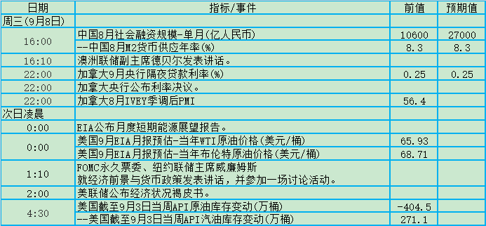 周三(9月8日)关键词:中国社融、加拿大央行决议、API、美联储褐皮书、威廉姆斯