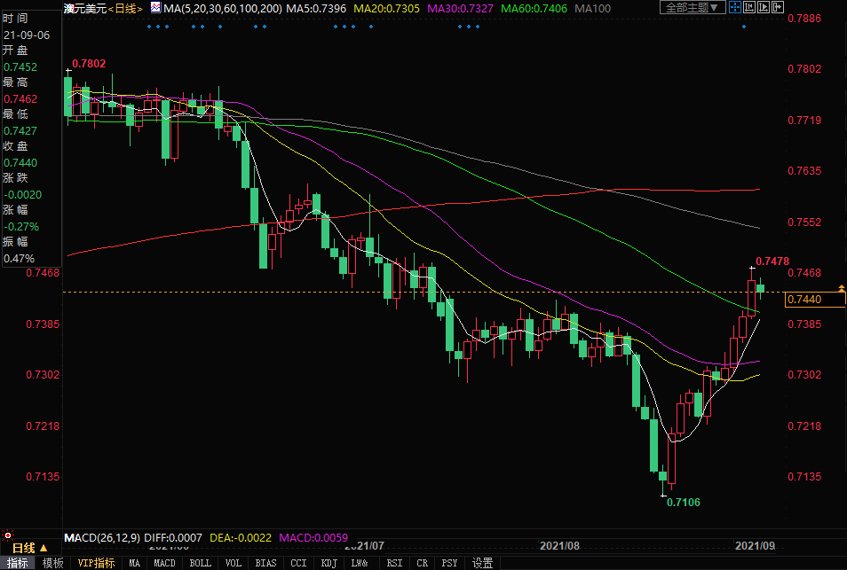 北京时间9月6日14:45,澳元兑美元报0.7440/42