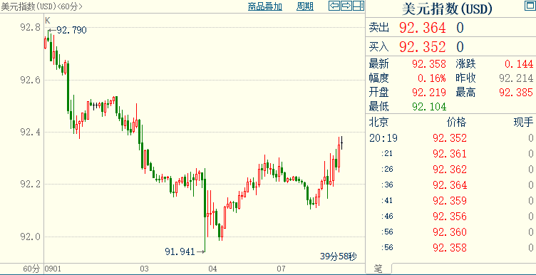 北京时间20:19,现货黄金下跌0.60%至1812.31美元/盎司;COMEX期金主力合约下跌1.06%至1814.3美元/盎司;美元指数上涨0.15%至92.356。