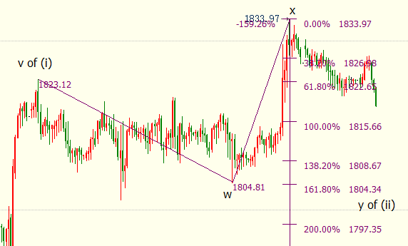小时图上看,金价自1834美元开启下行y浪走势,跌破138.2%目标位1809美元,后市料下探161.8%目标位1804美元。y浪是自1823美元开启的调整(ii)浪的子浪。(ii)浪是自1680美元开启的上行((i))浪的子浪。