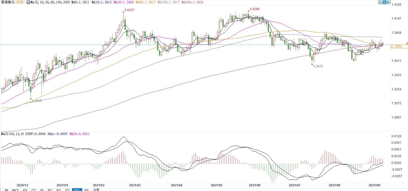 北京时间9月13日14:45,英镑兑美元报1.3822/24。