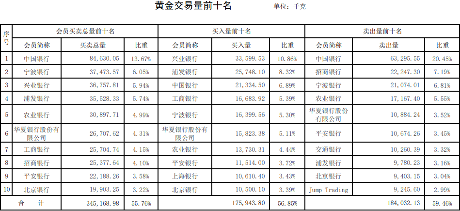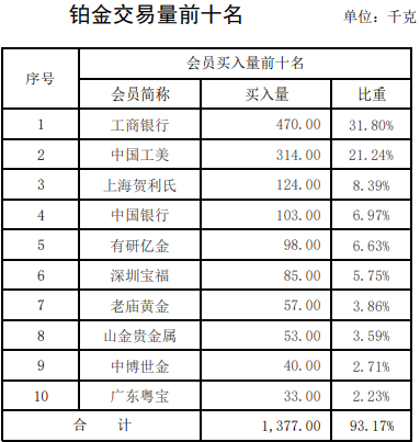 铂金交易方面,工商银行占据榜首位置,买入量达470千克,占比31.8%,中国工美第二,上海贺利氏第三。