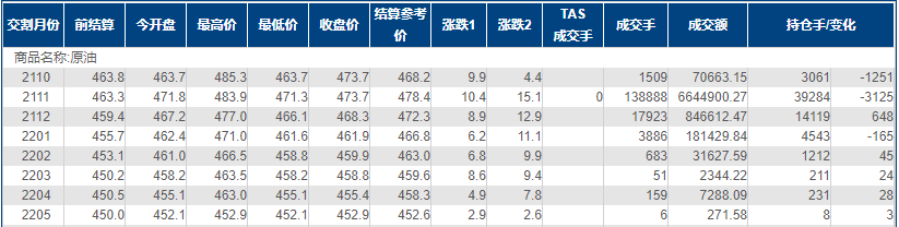 上海原油价格上涨,一度刷新逾20个月新高,主力合约2111终盘收于473.7元/桶,涨10.4元/桶,涨幅2.24%。