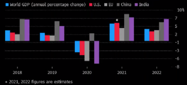 联合国贸易和发展会议(UN Conference on Trade and Development)在一份报告中称,继去年经济收缩3.5%之后,由于“激进”的政策干预以及发达经济体成功(尽管不完全)推出疫苗,2021年世界国内生产总值(GDP)可能会激增5.3%。