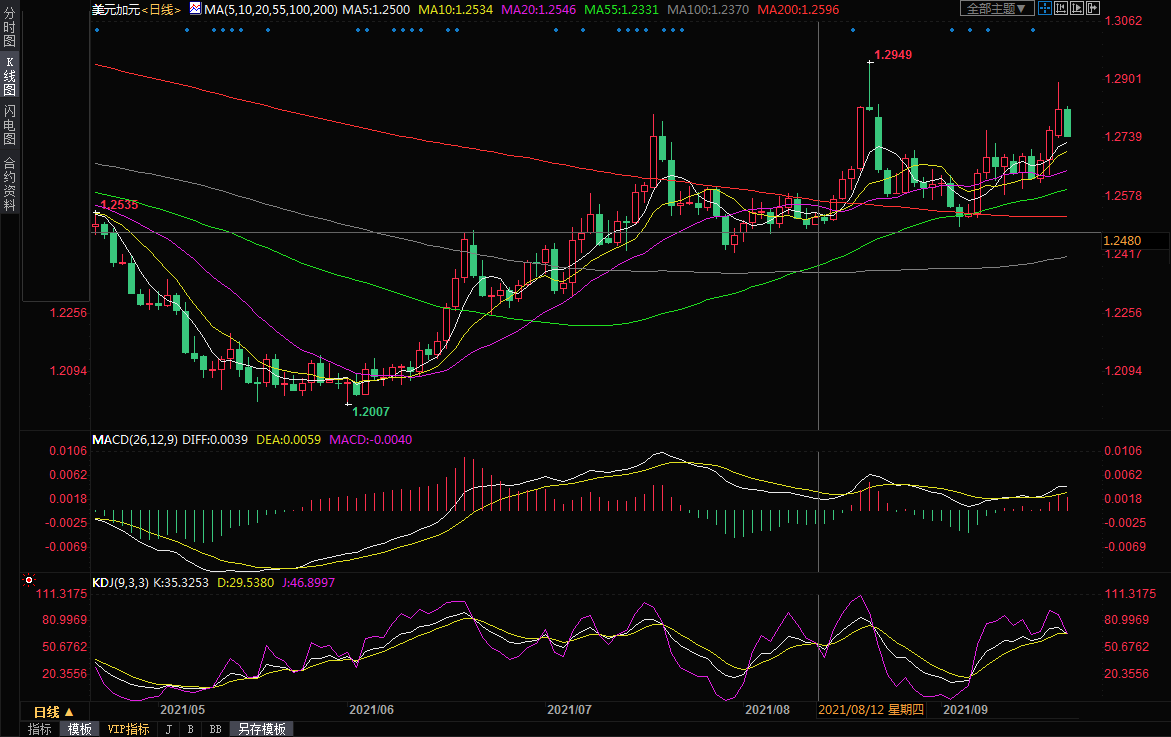 北京时间9月21日14:39,美元兑加元报1.2744/46。