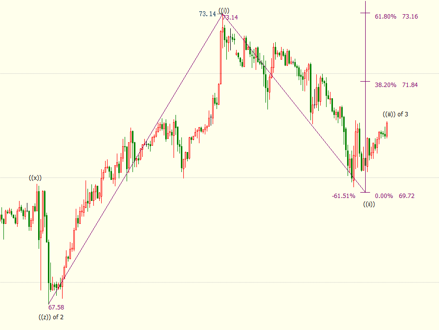 日线图上看,美油处于自61.74美元开启的上行((3))浪,上方近期阻力看向23.6%目标位78.37美元。小时图上看,油价处于自69.72元开启的上行((iii))浪,后市料升向38.2%目标位71.84美元。(iii)浪是自67.58美元开启的上行3浪的子浪。