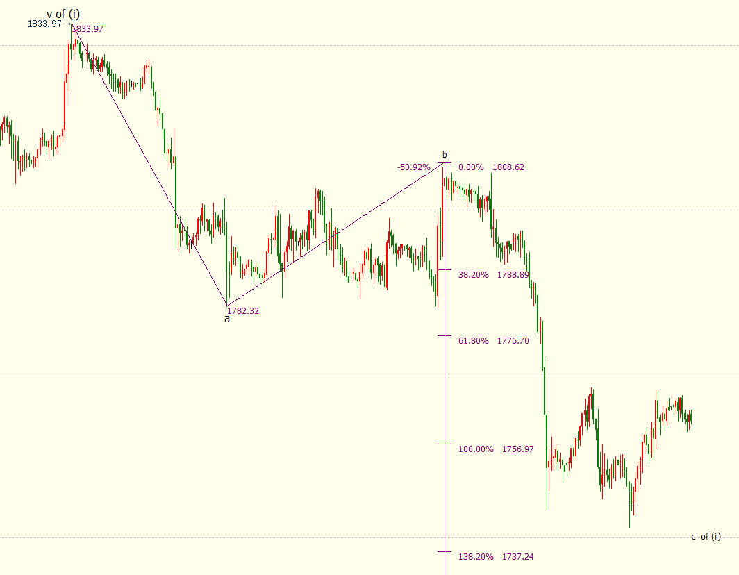 小时图上看,金价自1809美元开启下行c浪走势,跌破100%目标位1757美元,后市料下探138.2%目标位1737美元。c浪是自1834美元开启的下行(ii)浪的子浪。(ii)浪是自1680美元开启上行((i))浪的子浪。