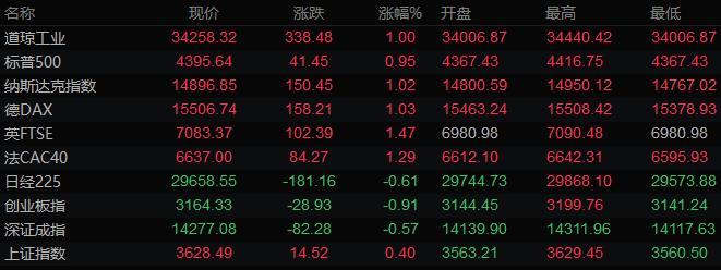 美股收盘情况:标普500指数上涨1%,报4395.64点;道琼斯工业平均指数上涨1%,报34258.32点;纳斯达克综合指数上涨1%,报14896.85点;纳斯达克100指数上涨1%,报15176.51点;罗素2000指数上涨1.5%,报2218.561点。