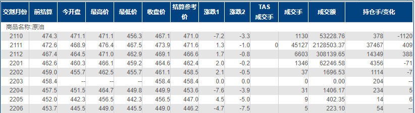上海原油价格上涨,主力合约2111终盘收于473.9元/桶,涨1.3元/桶,涨幅0.28%。