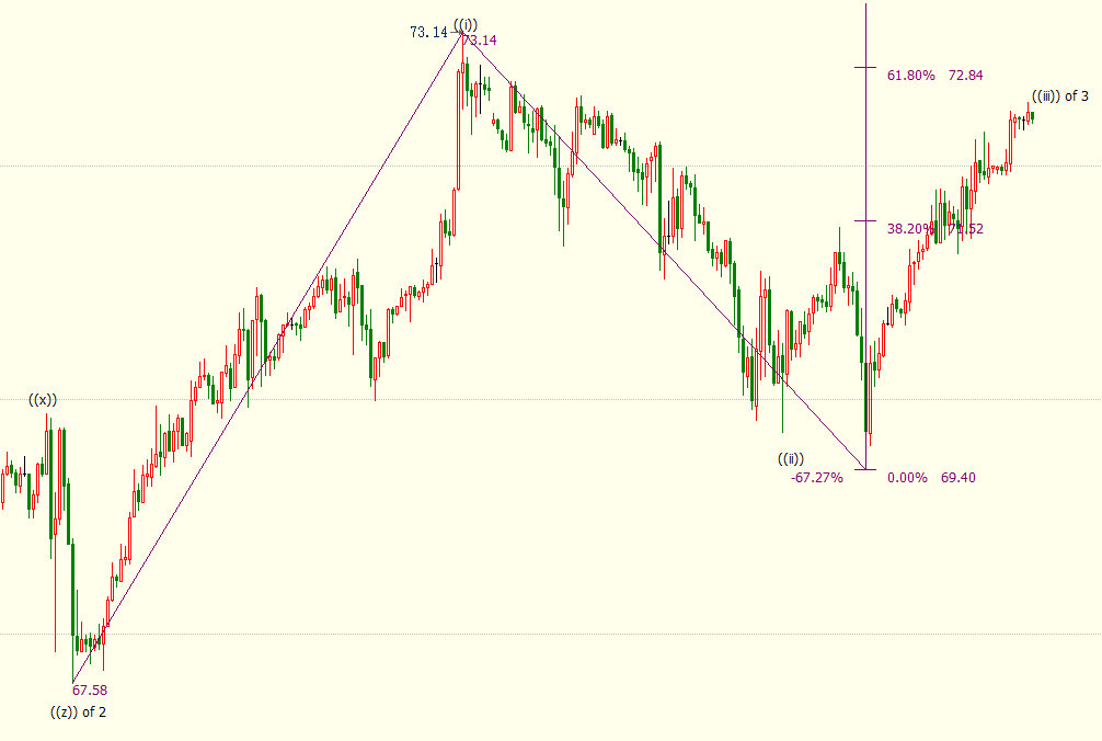 日线图上看,美油处于自61.74美元开启的上行((3))浪,上方近期阻力看向23.6%目标位78.37美元。小时图上看,油价处于自69.40美元开启的上行((iii))浪,料升破61.8%目标位72.84美元,并进一步上摸76.4%目标位73.65美元。(iii)浪是自67.58美元开启的上行3浪的子浪。