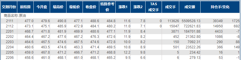 上海原油价格上涨,创20个月新高,主力合约2111终盘收于488.6元/桶,涨11.6元/桶,涨幅2.43%。