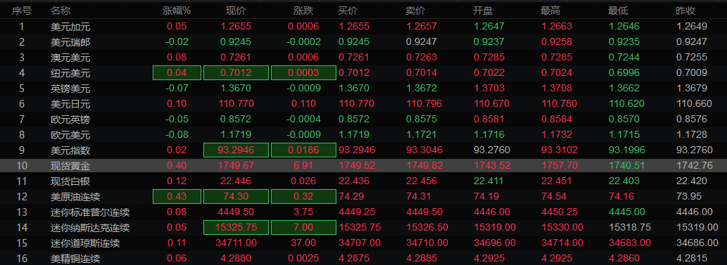 美元指数涨0.18%至93.27,上周上涨约0.05%;美国10年期国债收益率上涨2.8个基点至1.46%,上周四则跃升了13个基点,因为投资者对于美联储加息的预期增强。