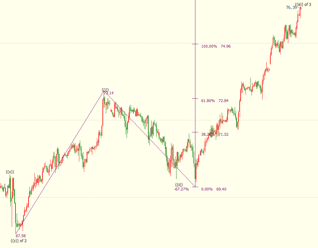 日线图上看,美油处于自61.74美元开启的上行((3))浪,上方近期阻力看向23.6%目标位78.37美元。小时图上看,油价处于自69.40美元开启的上行((iii))浪,升破123.6%目标位736.27美元,料进一步上摸138.2%目标位77.08美元。(iii)浪是自67.58美元开启的上行3浪的子浪。
