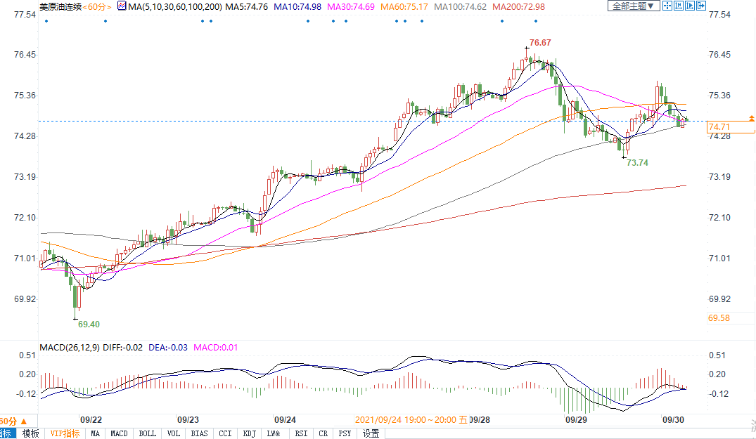 周三(9月29日)美油期货收跌0.46美元,跌幅为0.6%,结算价报74.83美元/桶;布油下跌0.45美元,报收78.64美元/桶,周二曾突破80美元/桶关口。此前EIA库存报告显示,截至9月24日,原油库存意外增加457.8万桶,预期减少215万桶,同时美国原油产量增加50万桶/日至1110万桶/日,导致油价承压。而美元走强也降低了这一大宗商品出口的吸引力。