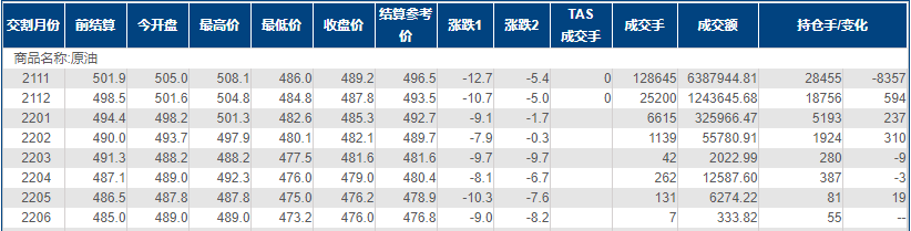 上海原油价格下跌,主力合约2111终盘收于489.2元/桶,跌12.7元/桶,跌幅2.53%。