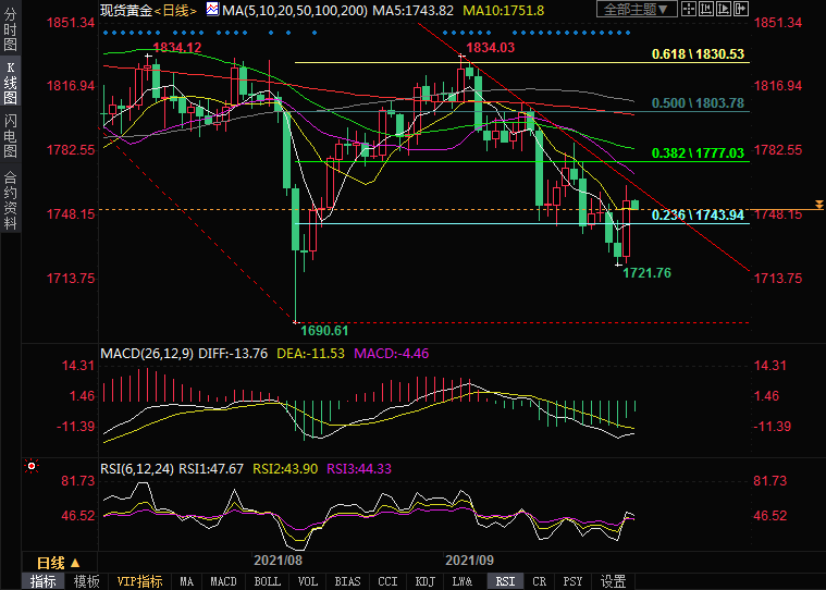 技术图来看,金价强势站上23.6%回撤位1743.94以及10日均线,短线下行的趋势得到遏制。另外,KDJ率先形成金叉,MACD绿柱快速缩短,显示多头能量正在不断积累。
