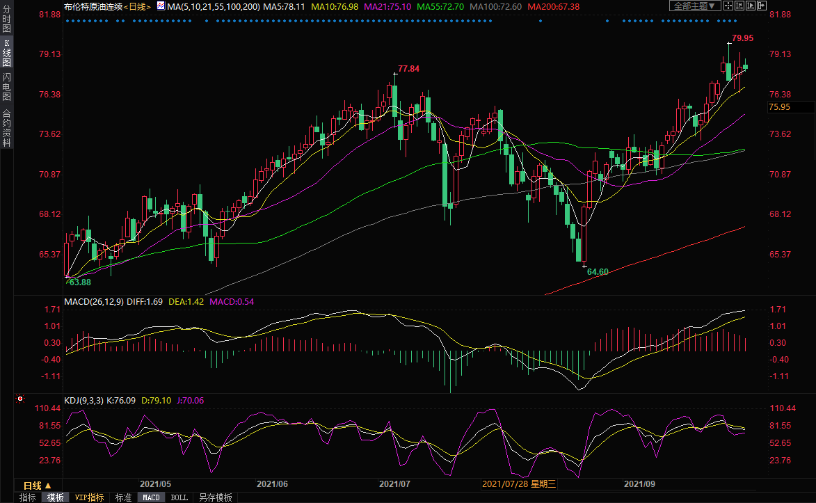 受美国意外停产和疫情冲击后需求强劲复苏推动,周二(9月28日)布兰特原油期货一度升至每桶80美元附近的三年高位,随后陷入高位震荡走势,周五(10月1日)亚洲时段,布油交投于78.20美元/桶附近。